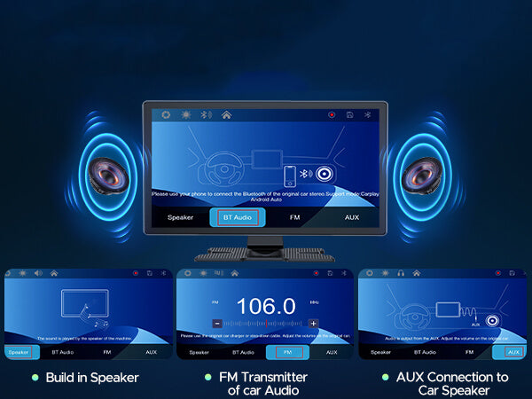 The LAMTTO Apple CarPlay screen features upgraded Bluetooth connectivity, allowing lossless audio streaming to car stereo speakers. It also supports FM wireless and AUX output for versatile audio playback options.