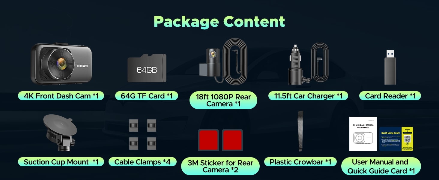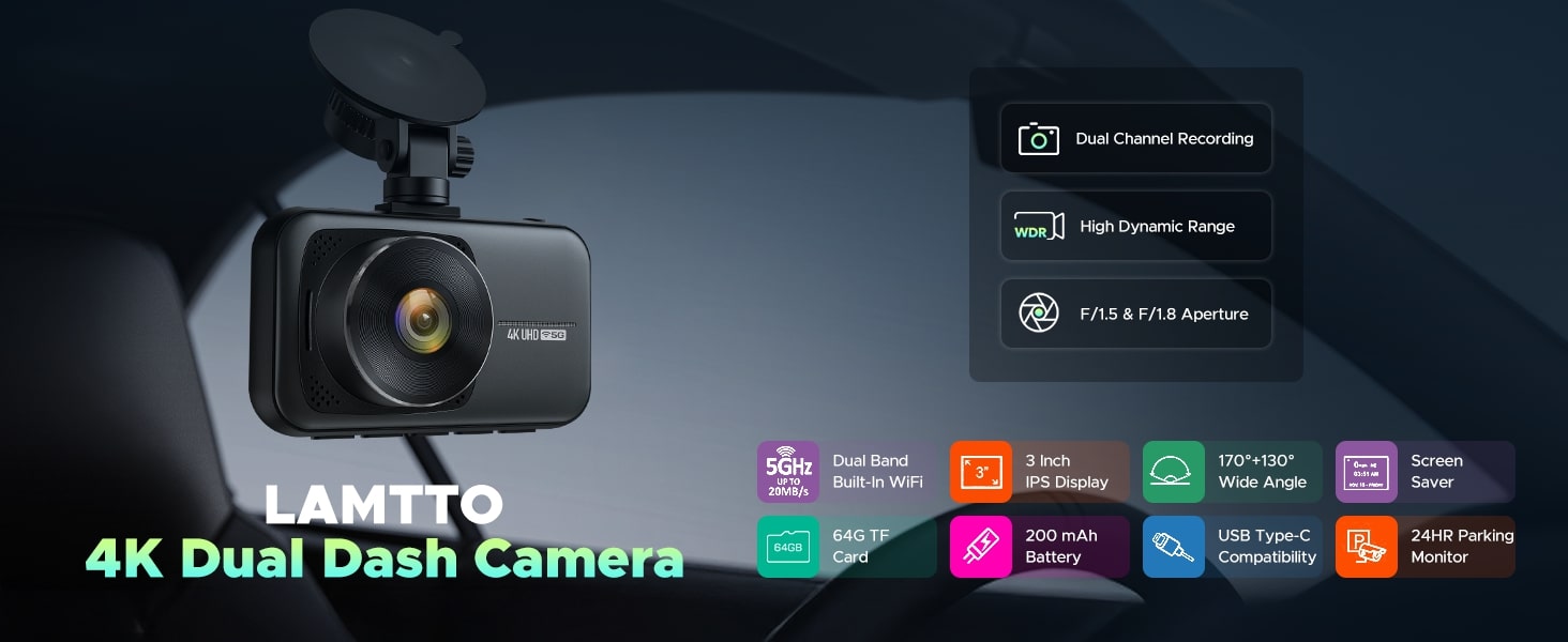 LAMTTO DC16 3" 4K Wifi Front and Rear Dual Dash Cam for Cars With 64GTFU3 Card