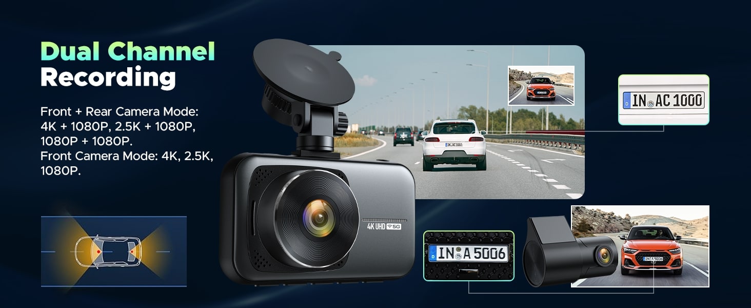 This system records in crystal-clear 4K front and 1080P rear resolution with a wide 140° angle, covering at least three lanes. Stay connected with 5G WiFi for easy video access and sharing. Plus, G-Sensor technology, loop recording, and parking monitor features provide comprehensive protection for your vehicle.