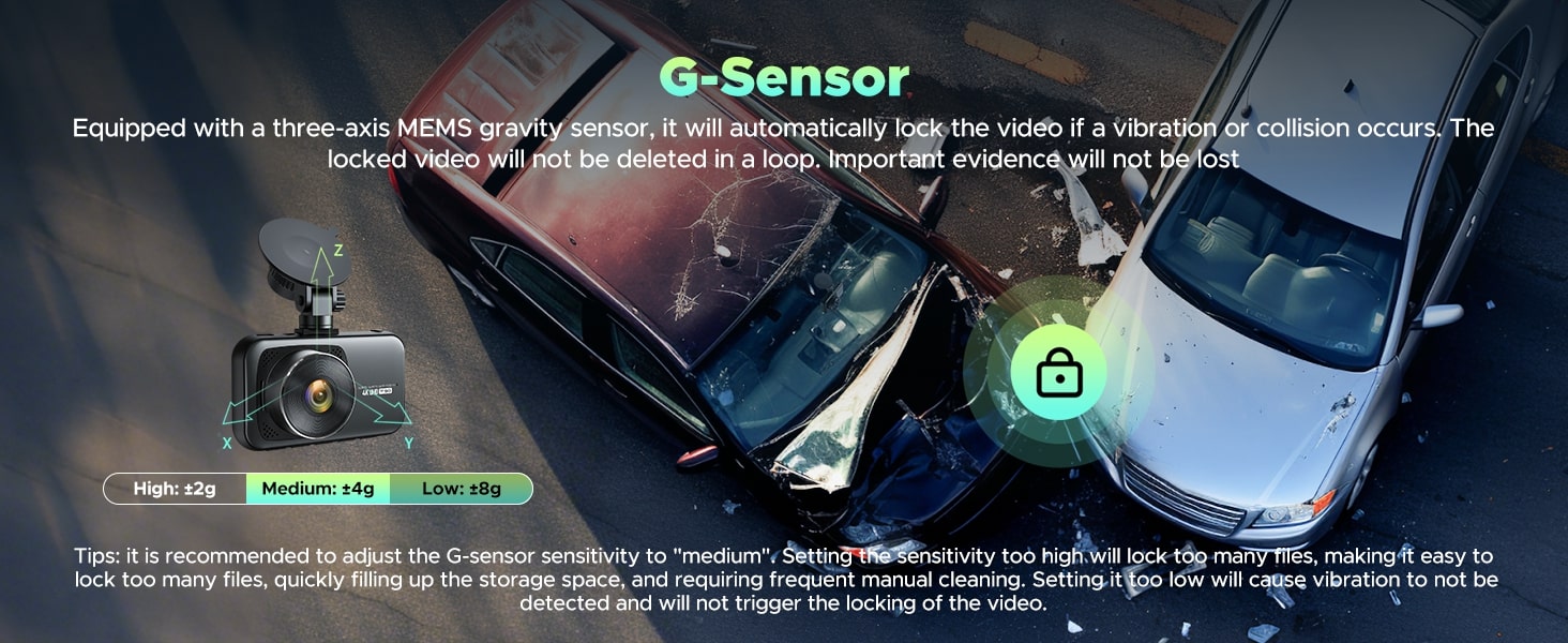The built-in G-Sensor acts as your steadfast protector, automatically detecting and locking critical footage in the event of a collision. This prevents crucial evidence from being overwritten, providing invaluable documentation for insurance claims and legal proceedings. Drive with confidence knowing you have a reliable record of every incident.