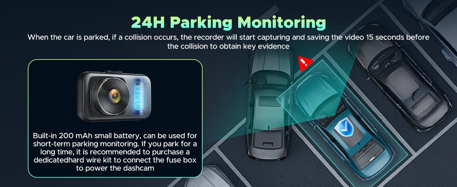 Safeguard your vehicle even when parked with the 24/7 Parking Monitor. The enhanced 5mAh battery provides continuous operation, recording any incidents that may occur while your car is off. For extended parking monitoring, a hardwiring kit (sold separately) is recommended for uninterrupted protection and ultimate peace of mind.
