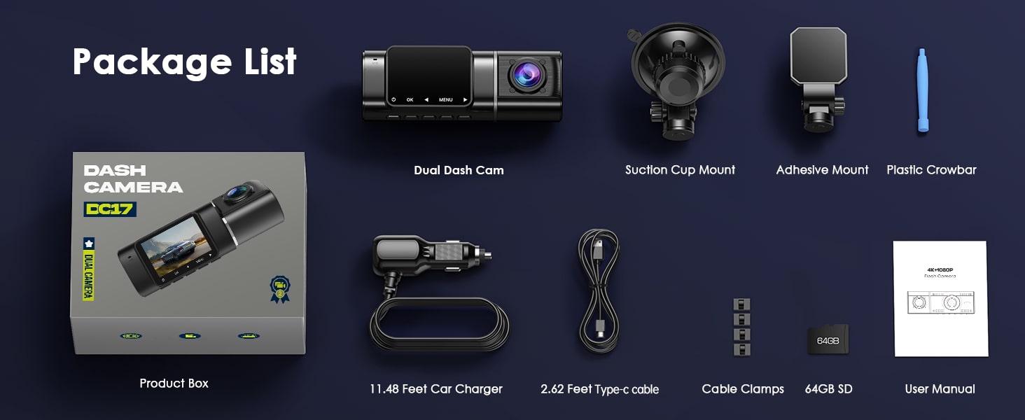 LAMTTO DC17 4K Front and Inside Dash Cam for Cars with 64GB SD Card