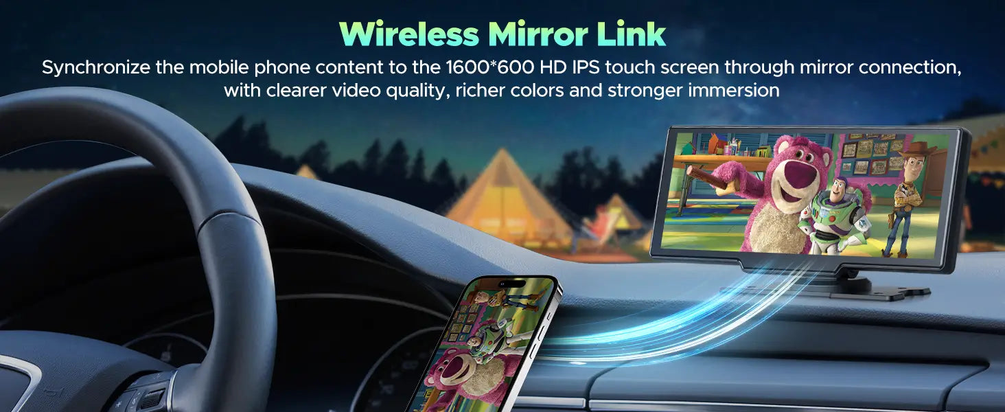 Use apple airplay & android case to connect your smartphone with carplay screen, then you can play youtube, Tiktok, etc. videos on carplay screen.This portable apple carplay screen features a resolution of 1600*600 and supports 1080P videos. Even outdoors or on trips, you can enjoy the high-definition large-screen video experience🤷♀️(Tips:Doesn’t support Netflix)