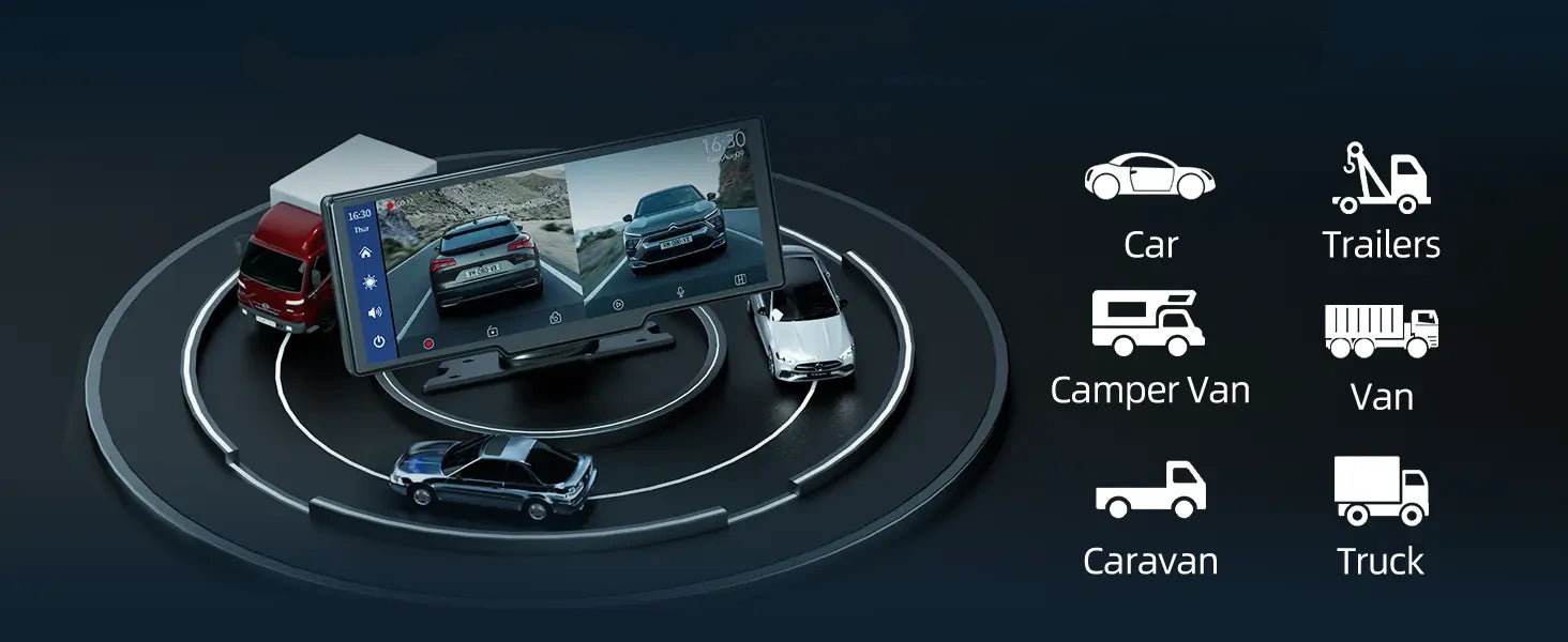 Equipped with a 360-degree rotatable suction cup mount and self-adhesive bracket, which can be firmly fixed on the dashboard console or windshield. It is very easy to remove and convenient to store, the screen is powered by a versatile 12-36V cigarette lighter socket, which is compatible with various vehicles, trucks, trailers, etc.