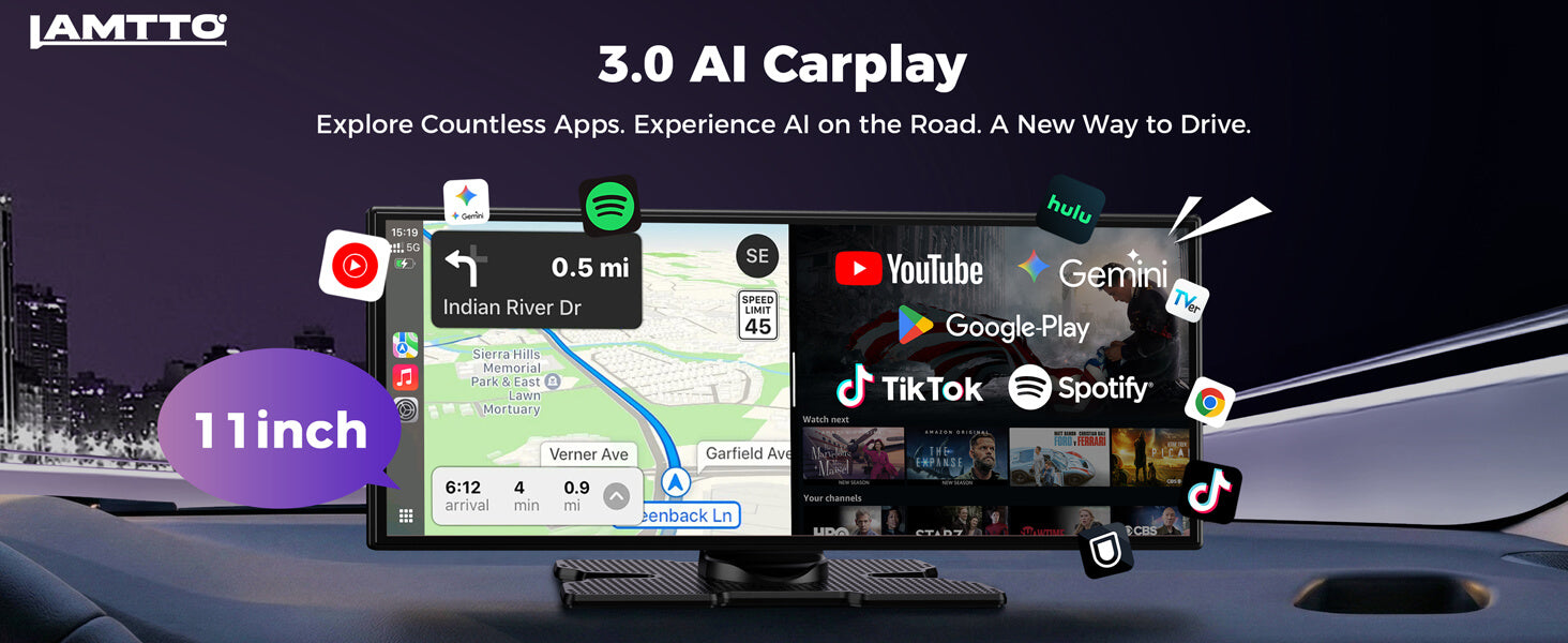 LAMTTO RC32 11’’ AI Wireless CarPlay with Google Play & Gemini AI Display for Road Trip Entertainment