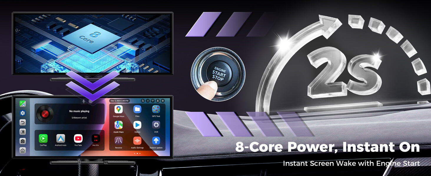 1-Second Instant Wake-Up, 8-core processor and 4GB+64GB, Backup Camera with Built-in DVR, Customizable Screen, Google Play & AI
