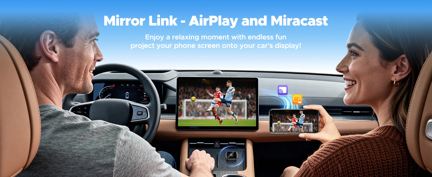 Through optimized AirPlay or Miracast protocols, experience ultra-low latency, high-definition video stream wireless transmission. Watch movies, short videos, or sports events, including TikTok and YouTube videos, on your car's large screen with perfectly synchronized audio and video for a lossless playback experience. Please note: Do not cast copyrighted paid video content.