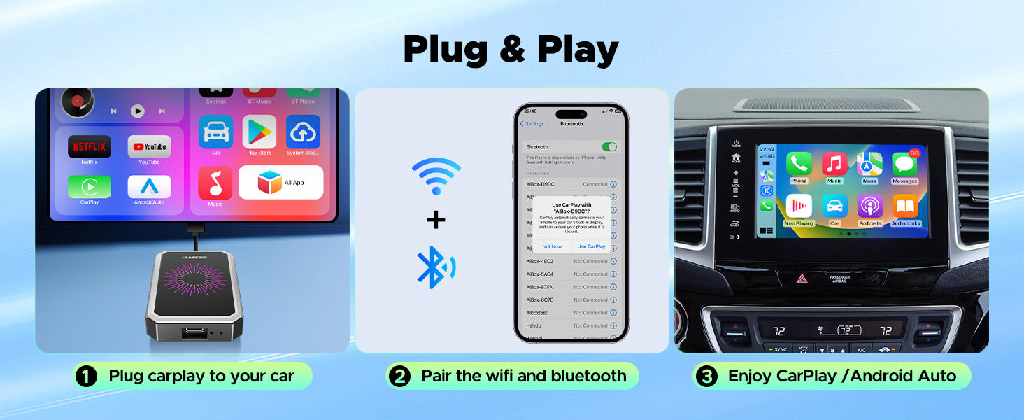 Upgrade your car in just seconds. No complex installation required—simply plug the adapter into your car's USB port, and it works immediately with your existing wired CarPlay system. This is the simplest way to add wireless smart features to your car, without any technical hassle or extra cables.